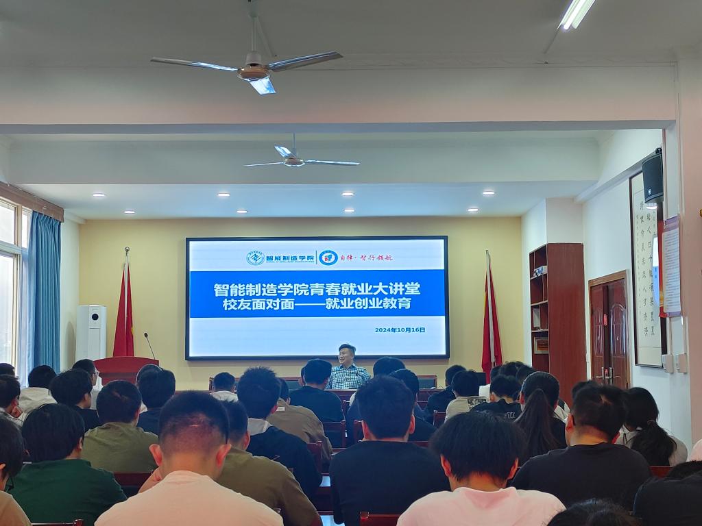 10月16日上午,智能制造学院邀请到四川锦特鑫科技有限公司总经理、四川福旺锦诚商贸有限公司总经理、四川全星科技有限公司总经理、四川达九科技有限公司执行总裁唐浩(智能制造学院2004级机电一体化专业)校友在砺志楼201会议室为我院2025届毕业生开展了就业创业意识专题教育。100余名学生参加了此次专题教育大会,会议由学院田朋飞老师主持。